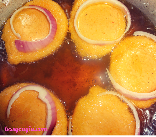 To fry the akara, scoop the mixture with a table spoon and slowly pour this into the oil and add onions in between the akara and also drop some into the oil for the special aroma and taste as shown below.